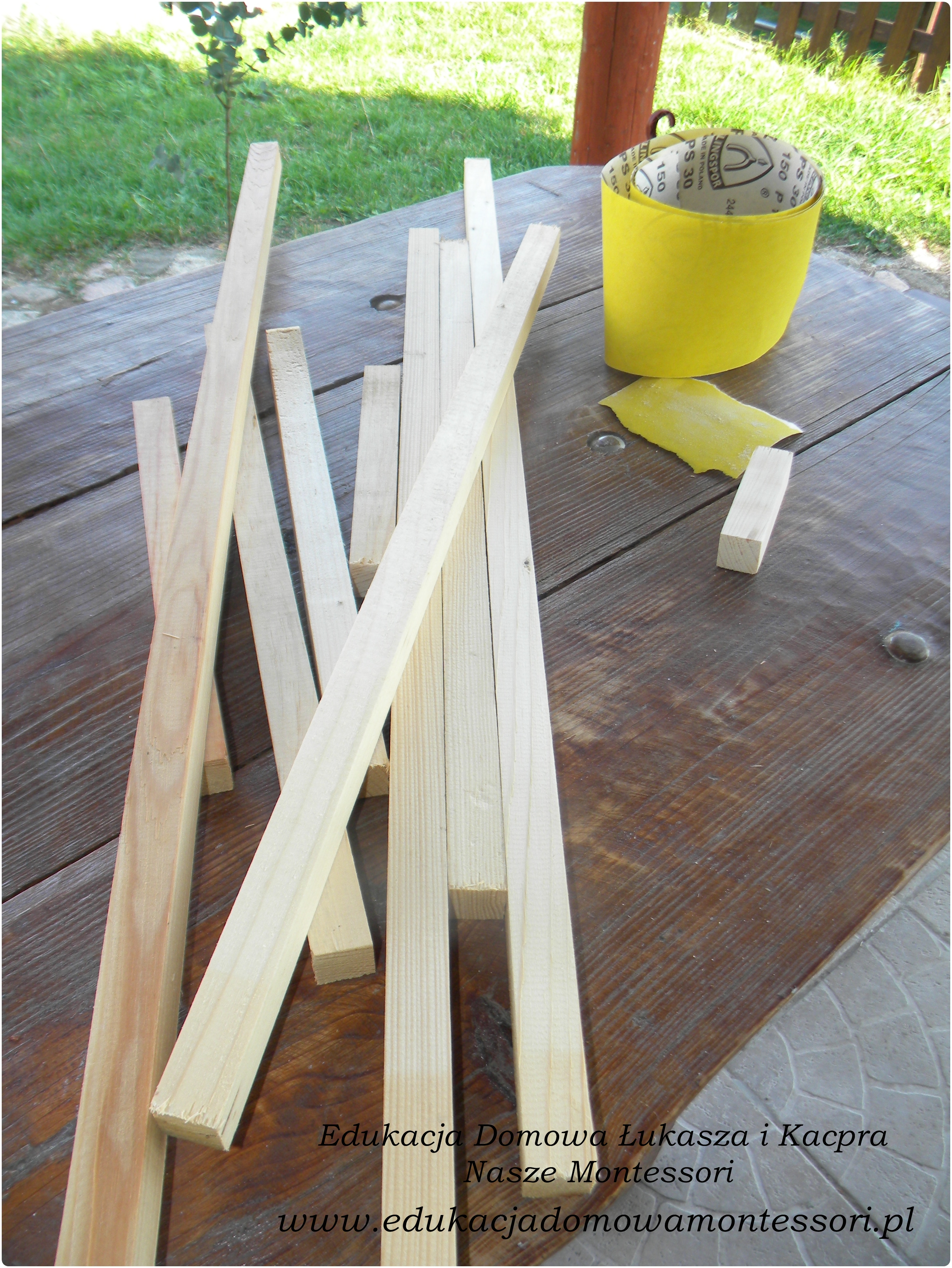 -potrzebne będą listwy o średnicy 2,5 cm X 2,5 cm. Potrzebujemy ich do jednego kompletu 10 szt o wymiarach od 10 cm do 100 cm,każdy kolejna belka jest większa o 10 cm (zatem 2 komplety to 2 x 10 cm, 2 x 20 cm itd )