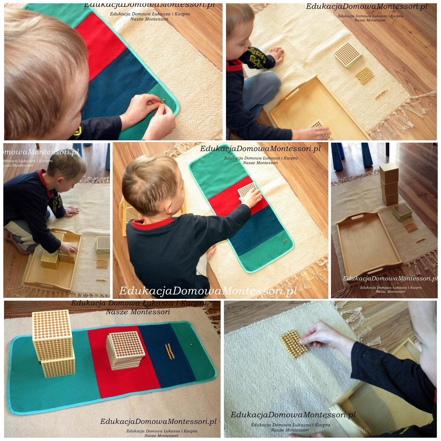 Zaczynamy od przedstawienia dziecku materiału, nazywając go Bankiem. Rozkładamy dywanik tuż obok stolika, przy którym będziemy siedzieć. Prosimy dziecko, aby przyniosło nam określoną ilość pereł z Banku. Najpierw prosimy dziecko o jedną kategorię czyli np. mówimy do dziecka, aby przyniosło dziewięć jedności.