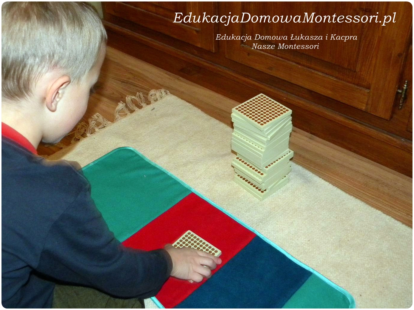 Pytamy dziecko co należałoby zrobić w tej sytuacji z tym materiałem. Dziecko powinno zaproponować podzielenie ilości na kategorie. Wstępnie porządkujemy materiał na dywaniku , oddzielając jedności, dziesiątki, setki, tysiące od siebie.